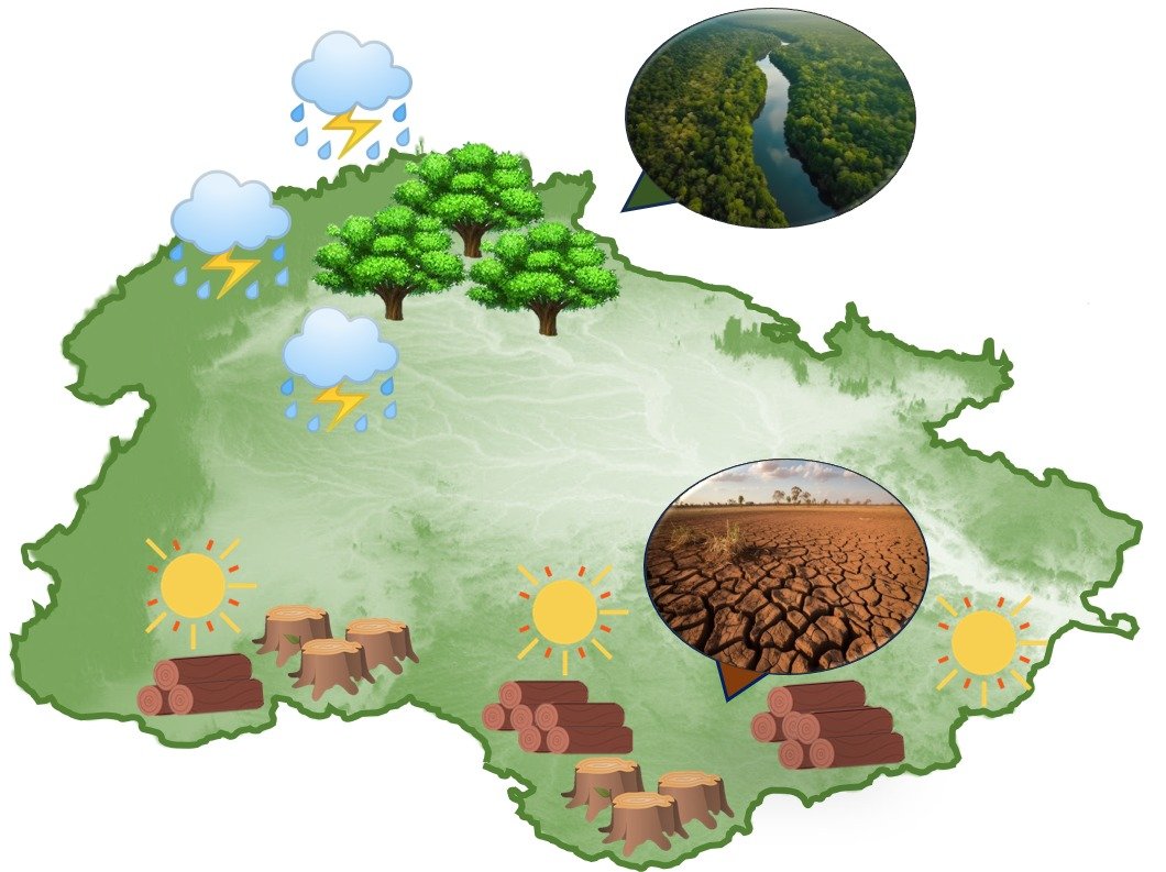 La cuenca del Amazonas, con su extenso bosque tropical, ha desempeñado un papel crucial como regulador natural del ciclo del agua, influyendo de manera significativa en la estabilidad climática a escala regional y global. Sin embargo, la deforestación ha alterado este equilibrio, generando una serie de impactos de gran alcance que van más allá de sus límites geográficos. En este estudio, se enfocó en caracterizar la deforestación a lo largo de dos décadas mediante tecnología satelital como MODIS, con una resolución de 500 m, para comprender su evolución espacial y temporal. Además, se utilizó el Índice Estandarizado de Precipitación y Evapotranspiración (SPEI) para evaluar la intensidad de la sequía durante 42 años. Este índice proporciona una medida objetiva al considerar tanto la evaporación como la transpiración de las plantas, permitiendo cuantificar la intensidad y duración de los períodos de sequía en la región, así como identificar las áreas más afectadas dentro de la cuenca del Amazonas.